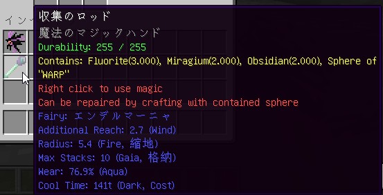収集のロッドは、右クリックで魔法を発動すると、発動した地点を中心にした球状の範囲内に存在するアイテムエンティティを発動者の足元に瞬間移動させる妖精武器です。