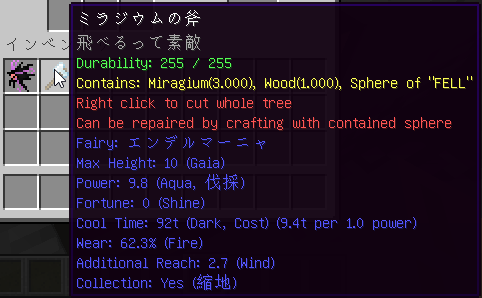 ミラジウムの斧で魔法を発動した際に、Collection(収集)の特殊効果を発動できるようにするパラメータを追加しました。発動体となる妖精が≪縮地≫の超能力を10以上持っている場合に発動可能になります。