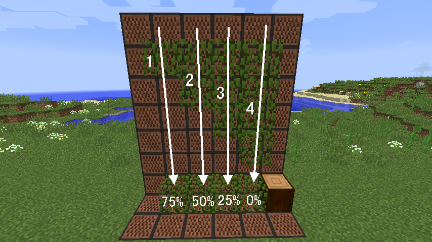 ある方向から降り注ぐ光は、葉ブロック4個分の遮蔽で完全に遮断されます。