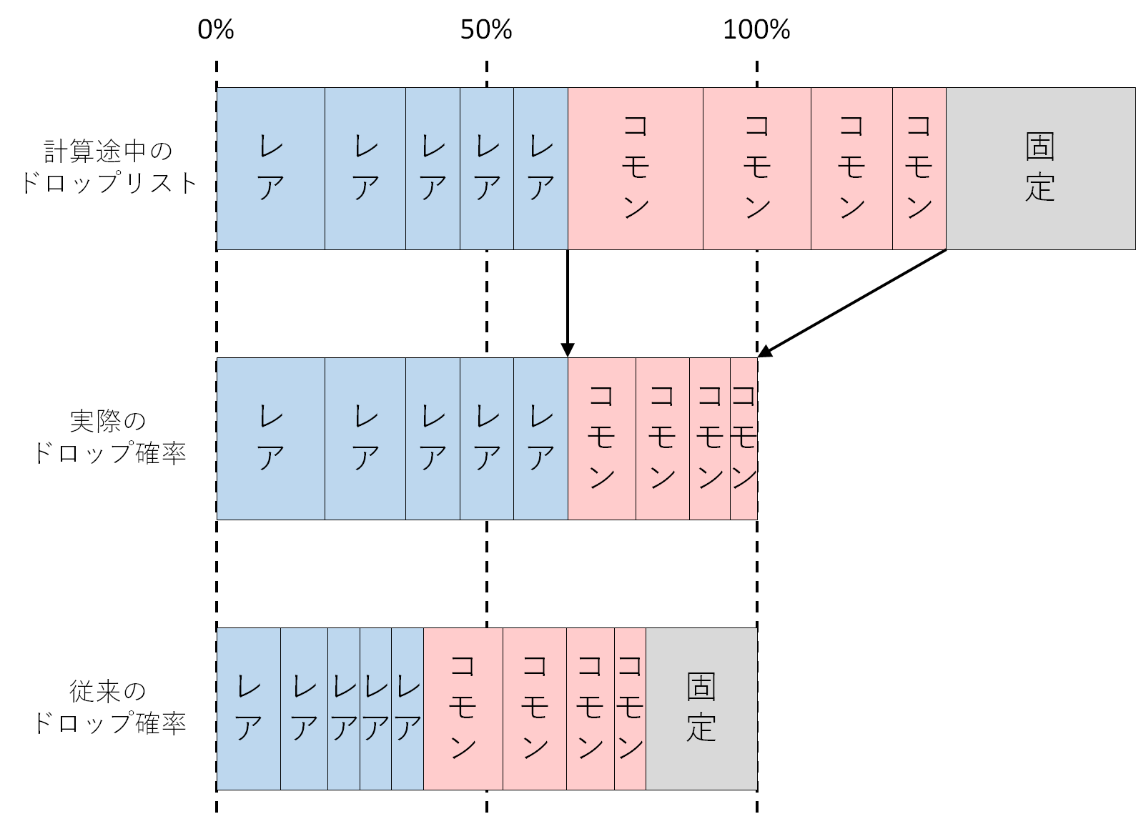 ドロップ率が100%を超えた場合、優先度が低い判定枠から順に確率を削ります。