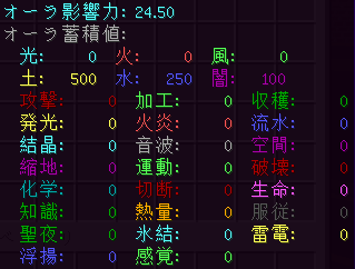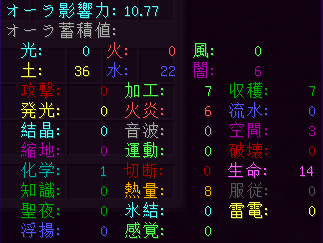 オーラ蓄積値は、6種のマナと全種のエルグごとに蓄積します。
